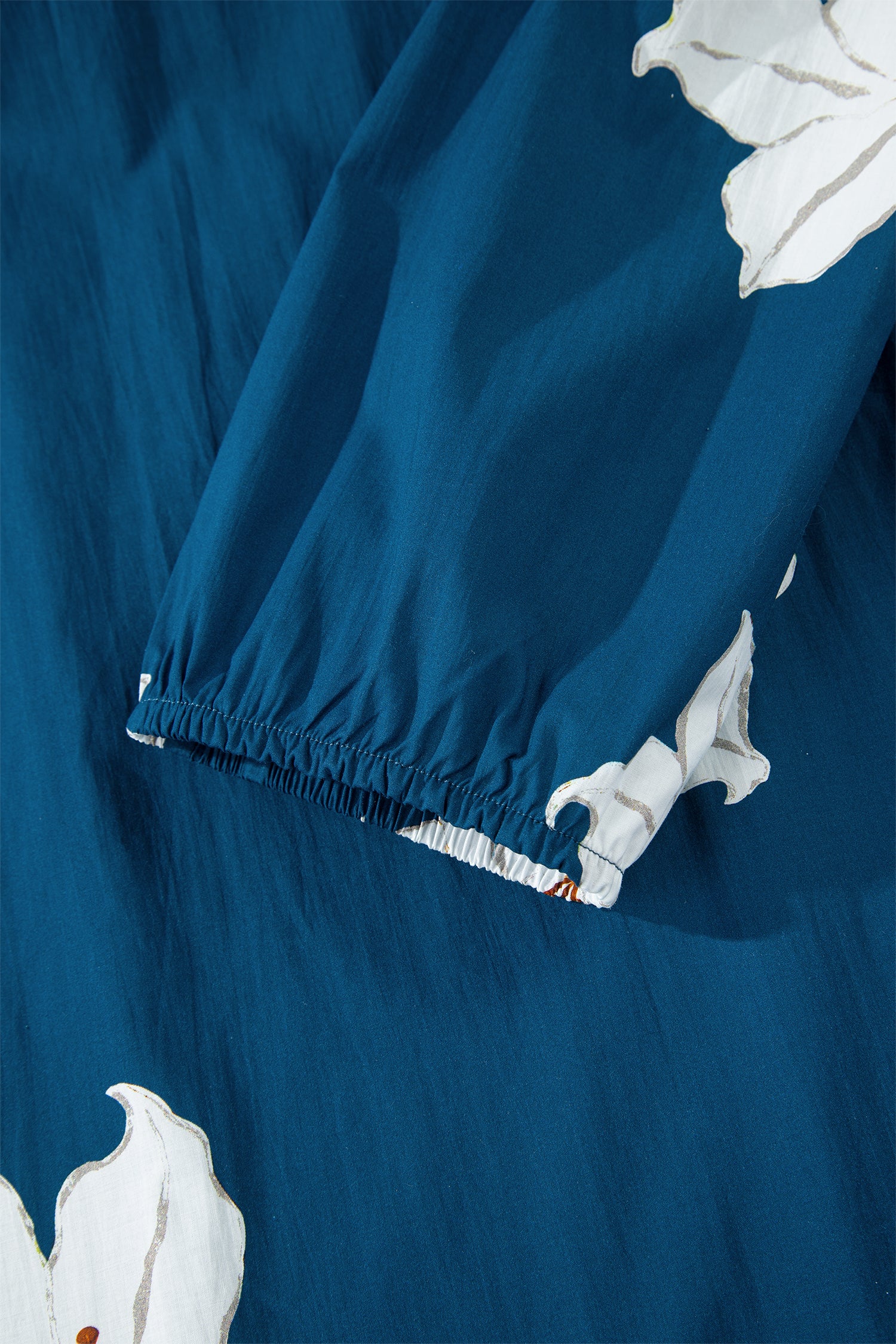 Blue Floral Print Shirt Collar V Neck 3/4 Sleeve Shift Midi Dress